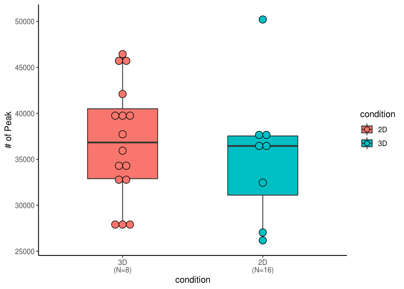ggplot(peak.summary.df, aes(x=condition, y=numPeak, fill= condition))+ scale_x_discrete(labels=xlabs)+geom_boxplot(width=0.5,position = position_dodge(0.8))+ geom_dotplot(binaxis = "y", stackdir='center', dotsize = 1,position = position_dodge(0.8))+ labs(y="# of Peak") + theme_classic()## Bin width defaults to 1/30 of the range of the data. Pick better value with `binwidth`.