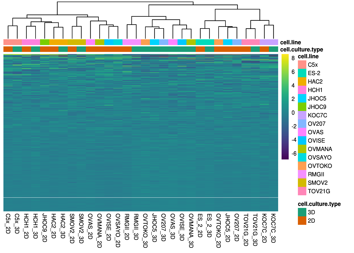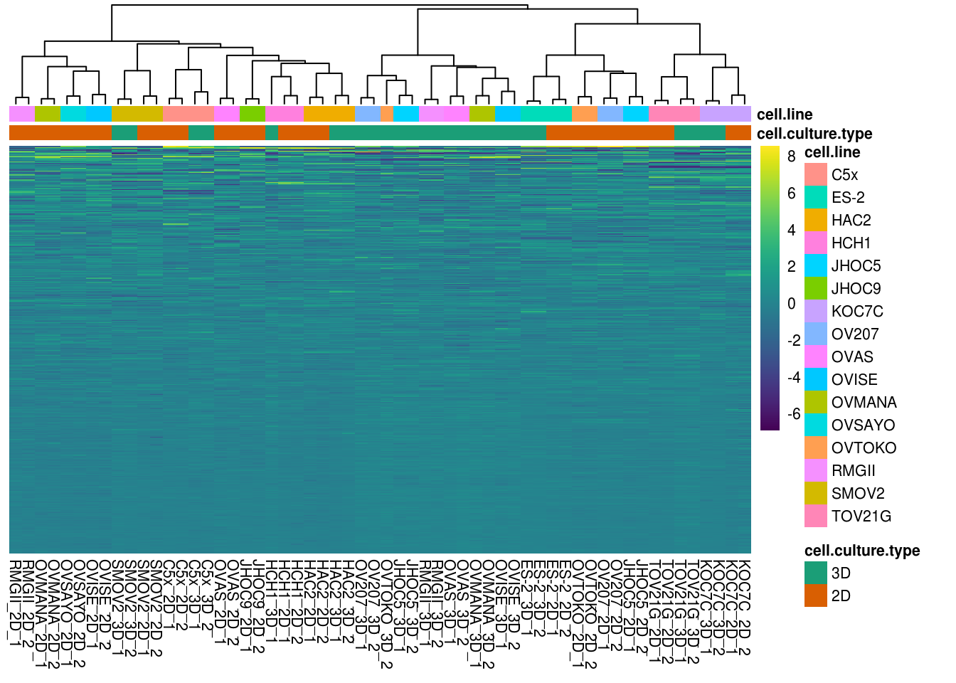 ann.colors <- list(cell.culture.type= c(`3D`= "#1B9E77",`2D` = "#D95F02"))df <- as.data.frame(rppa.normal.df[c("cell.culture.type","cell.line")])